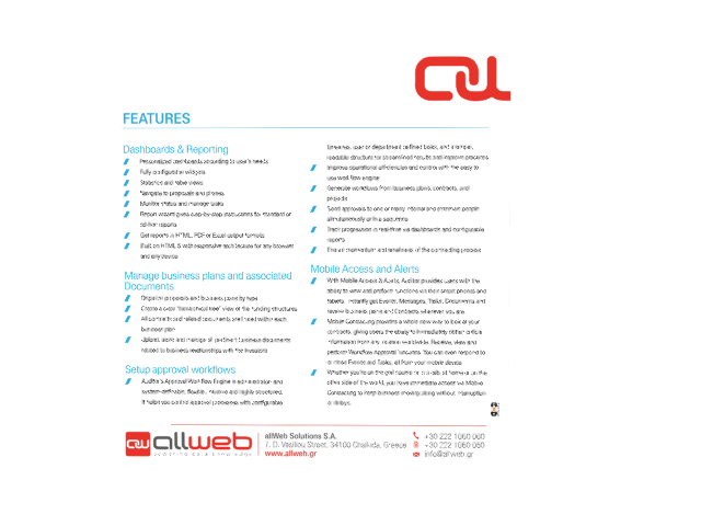 Allweb provides cloud-based contract and project management software platform that helps public and private organizations to accept, evaluate, negotiate, and administer business plans for state aid funding and more! Auditor is web application that works with your online accounts and allows your organization to implement these processes seamlessly for the various contract processes from contract authoring, contract review and approvals, electronic signatures, and a centralized contract repository that helps you define all of your contracts and automate the various alerts and milestone processes, along with search and reporting capabilities. Used by hundreds Intermediate Organizations dealing with state aid funding, our contract and project management system supports document retention policies beyond just the contract documents. Allweb provides Auditor under a SaaS model including storage, retrieval and archival functions which are configurable based on your organization’s workflows.